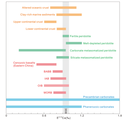 科学问题:金伯利岩源区的碳酸盐究竟来自再循环的海相沉积碳酸盐,还是地幔原生碳酸盐?传统地球化学方法(如Sr-Nd-Pb同位素)难以准确示踪碳酸盐来源,因为碳酸盐熔体的Rb/Sr比值很低,导致放射性Sr同位素体系无法有效记录源区特征。此外,海相沉积碳酸盐的补偿深度(CCD)也限制了其进入深部地幔的规模。钙同位素则能有效区分:地表沉积碳酸盐具有显著偏轻的δ⁴⁴/⁴⁰Ca值(由于碳酸盐沉淀过程中的同位素分馏),而地幔储库(BSE、MORB)具有相对均一的Ca同位素组成。BSE的δ⁴⁴/⁴⁰Ca约为0.94 ± 0.05‰,MORB约为0.85 ± 0.09‰,二者均显著重于大多数海相沉积碳酸盐。
