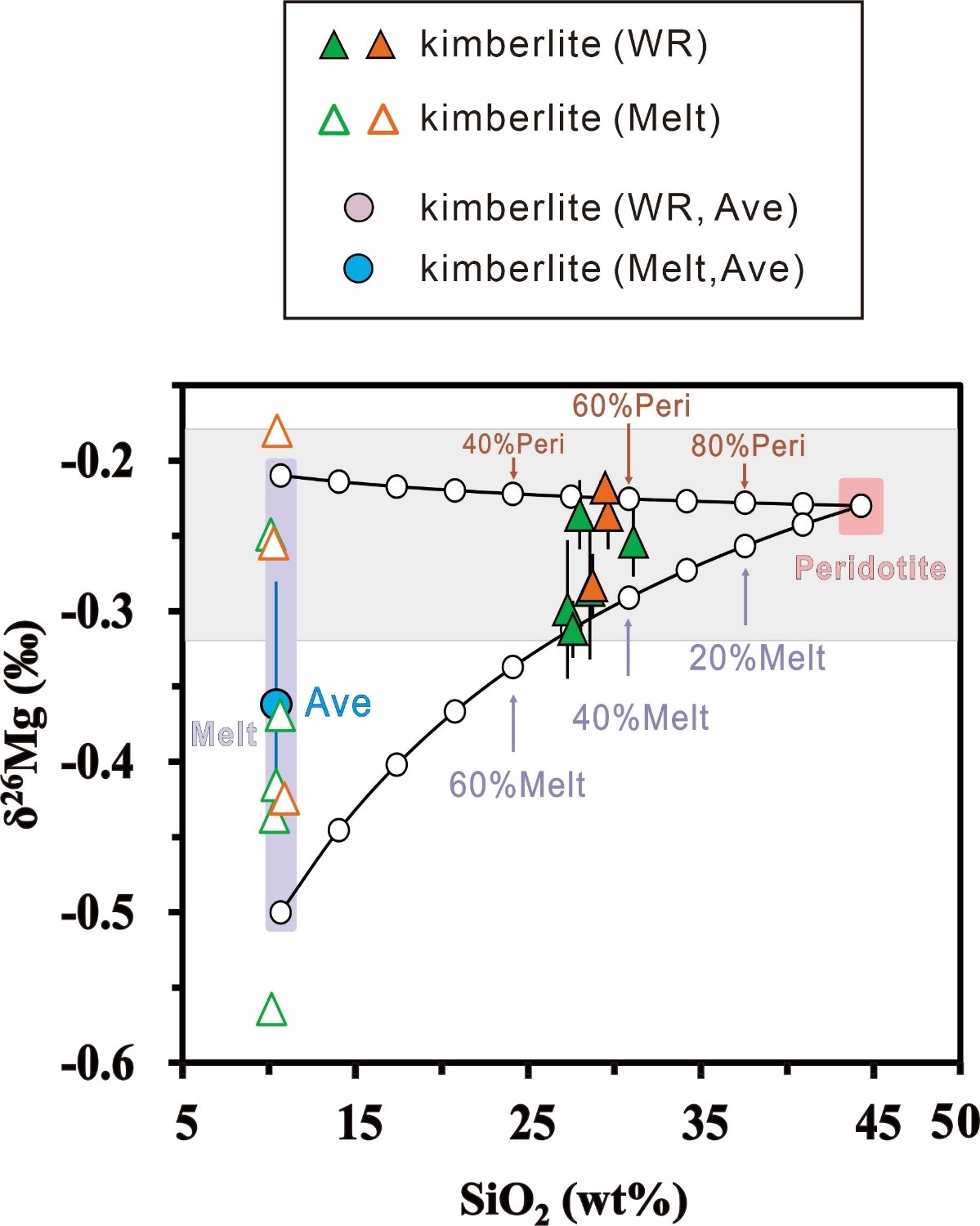 (2)初始富碳熔体的 δ26Mg 值为–0.56~–0.18‰ (平均值为–0.36‰),落入幔源碳酸盐熔体的典型范围(图3),且未显示俯冲物质输入所预期的元素或同位素异常特征,表明深俯冲含碳物质对该熔体形成的贡献可以忽略。