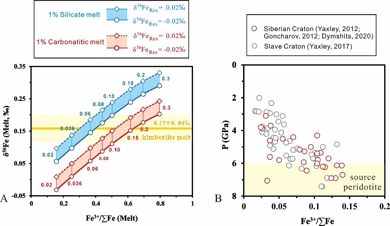 (3)结合Fe同位素、部分熔融过程指标与氧化还原参数,并通过 Fe 同位素部分熔融模型约束,系统评估了地幔氧化还原熔融过程在初始富碳熔体形成中的作用。