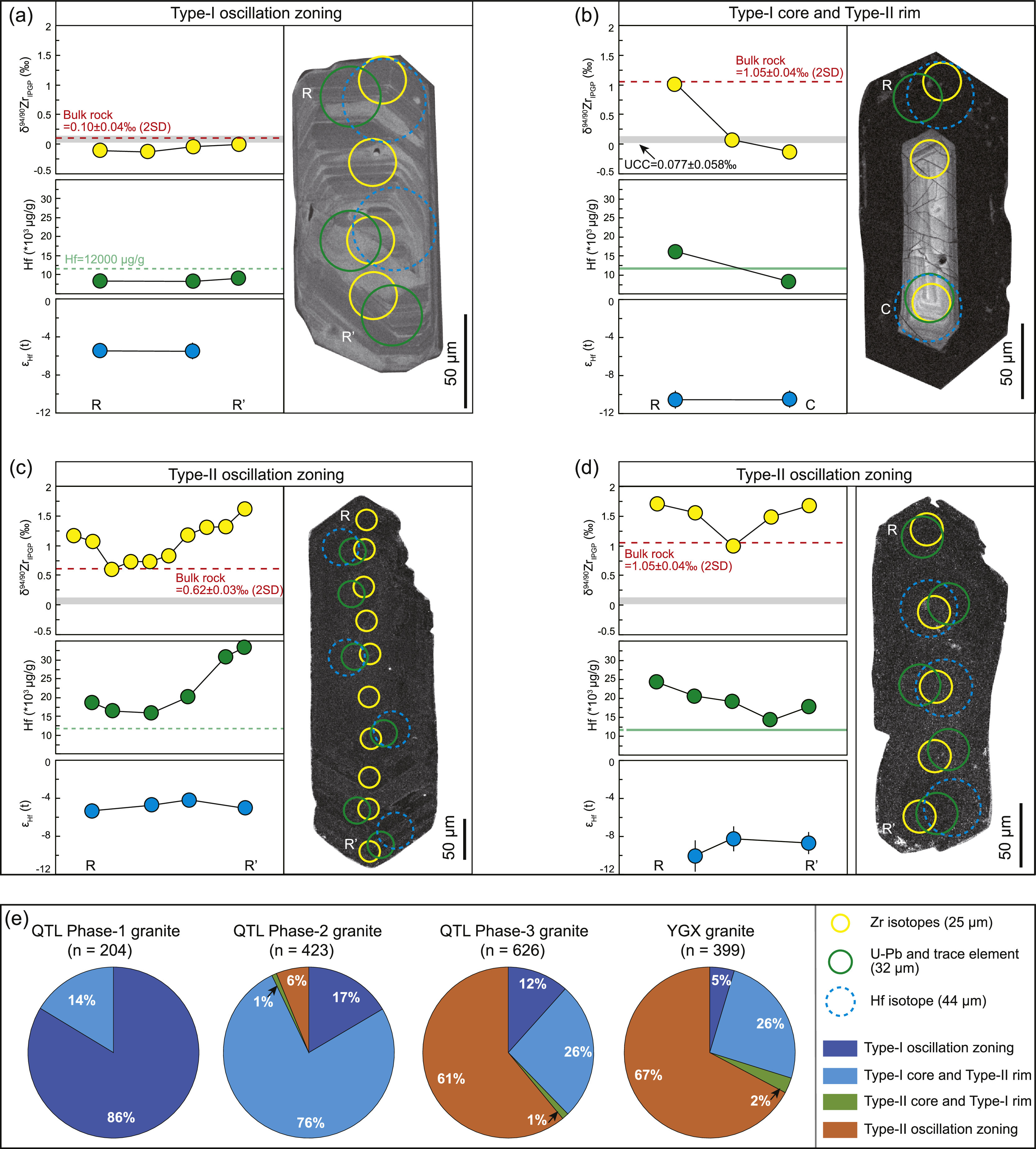 作者进行了矿物相分析、全岩主量元素和微量元素分析、全岩Zr同位素分析,此外对锆石进行CL成像、微量元素、Hf同位素、U-Pb定年、原位Zr同位素分析。锆石可以根据CL图像颜色深浅分为2类,其振荡环带、Th/U等均为岩浆锆石的特征。无论是在单个锆石晶体内部,还是在同一样品中的不同锆石颗粒之间,都可以观察到这样一个规律:从Type-I锆石到Type-II锆石,δ⁹⁴/⁹⁰Zr值是逐渐升高的;而且这种变化不受整体岩石SiO₂含量(66–77 wt.%)的影响。且锆石的δ⁹⁴/⁹⁰Zr与Hf含量、Zr/Hf比值的强相关性,将Zr同位素与岩浆分异联系起来。
