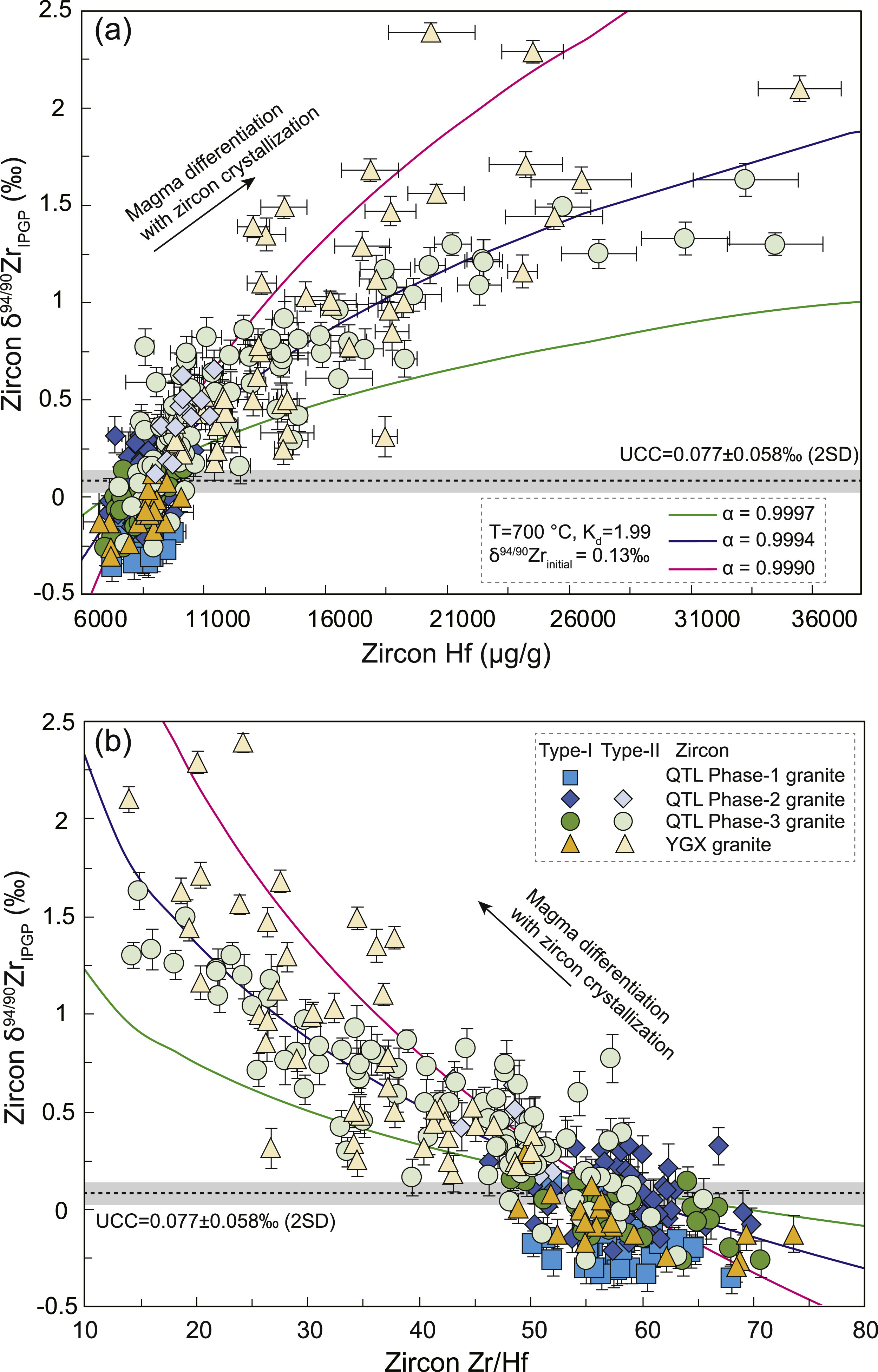 锆石中大量的Zr同位素分馏也发生在演化程度较低的花岗岩中。在岩浆结晶和分异过程中,晶体可能悬浮在岩浆中,或与正在演化的熔体物理分离。只有锆石结晶过程,如果没有与熔体物理分离,并不一定会导致全岩锆同位素的显著变重。锆石与熔体的有效物理分离对于获得全岩Zr同位素变重十分重要。作者使用 Rayleigh 分馏模型拟合锆石的 Zr 同位素演化趋势,估算得出高分异花岗岩中需要发生相当强的锆石移除作用,才能解释 QP3 和 YGX 的高 δ94/90Zr。模型结果显示,这些高分异样品通常要求超过 60% 的锆石分离,部分情形甚至更高;相比之下,普通花岗岩的锆石分离程度很低,因此其体岩 Zr 同位素仍保持接近上地壳平均水平。