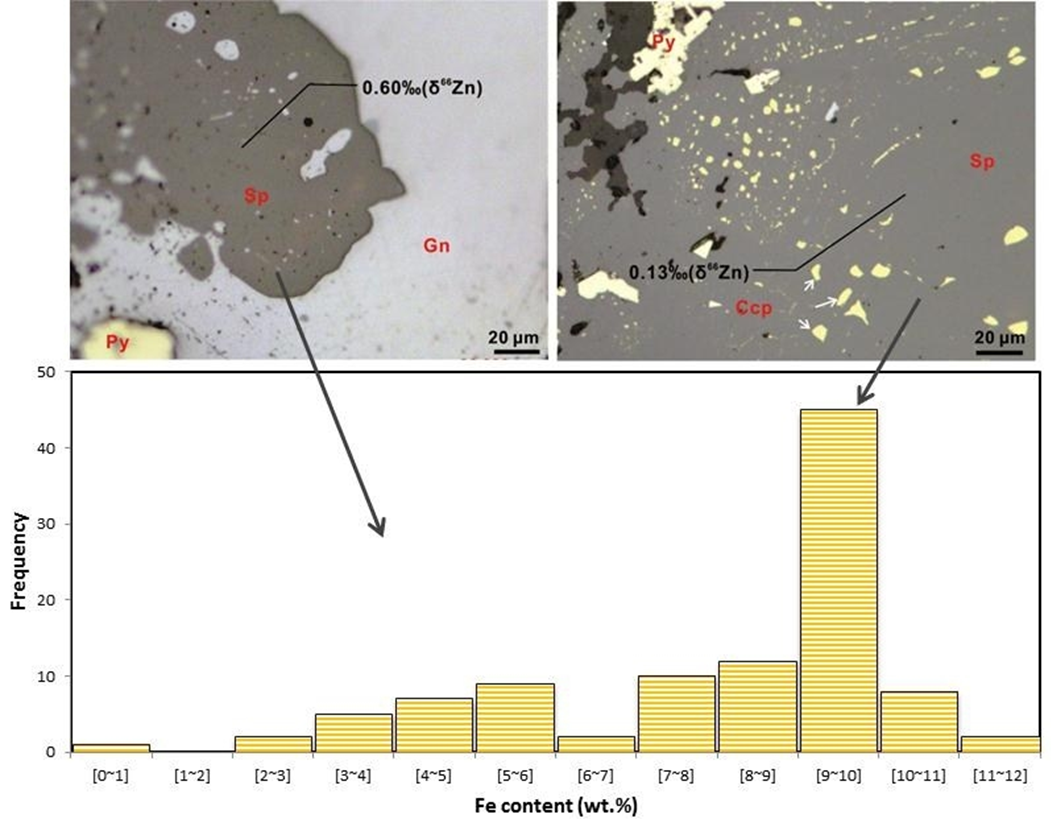 首先聚焦于岩浆热液系统中Zn同位素的分馏。通过对冷水坑Ag-Pb-Zn矿床不同其次闪锌矿进行研究,结果表明早期形成的闪锌矿具有较高的Fe含量和较轻的Zn同位素组成,晚期形成的闪锌矿具有较低的Fe含量和较重的Zn同位素组成(图1),符合瑞利分馏模型。模拟计算初始成矿流体的δ66Zn值约为0.26‰,低于成矿相关和无关的长英质岩石(δ66Zn= 0.23‰-0.69‰),支持流体出溶过程中的同位素分馏。热液流体比其残余熔体更富集Zn且具有更轻的Zn同位素组成,Zn同位素分馏受流体出溶程度和挥发分(如Cl-和HS-硫氢根离子)浓度的显著影响。