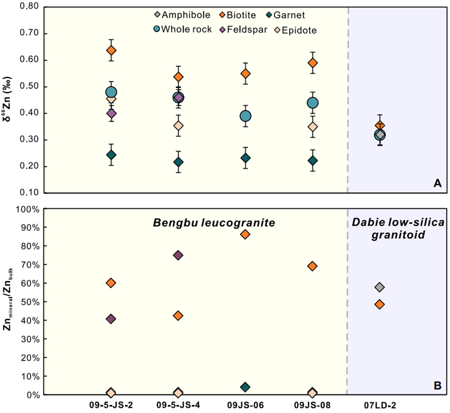 关于部分熔融过程中Zn同位素分馏行为,该报告重点对比了大别造山带与蚌埠隆起两类花岗岩的成因与Zn同位素特征。大别地区的低硅花岗岩(SiO2<70 wt.%)来源于镁铁质下地壳的高温部分熔融,残留相以石榴石为主,其δ66Zn值为0.27-0.38‰,略高于原岩,分馏程度有限(约0.04‰)。而蚌埠的高硅淡色花岗岩(SiO2>70 wt.%)则来源于长英质片麻岩的低温部分熔融,残留相包括黑云母和石榴石,其δ66Zn值为0.28-0.49‰,显著高于原岩,分馏幅度达约0.2‰。通过对单矿物Zn同位素组成的分析,发现黑云母是重Zn同位素的主要载体,其δ⁶⁶Zn值高于长石、绿帘石和石榴石,黑云母-石榴石之间的Δ⁶⁶Zn可达0.35‰。部分熔融模拟结果表明,在仅含残余石榴石的高温熔融过程中,Zn同位素分馏有限;而在同时含残余黑云母和石榴石的低温熔融过程中,分馏显著增强,表明黑云母的残留是控制高硅花岗岩Zn同位素组成的关键因素。